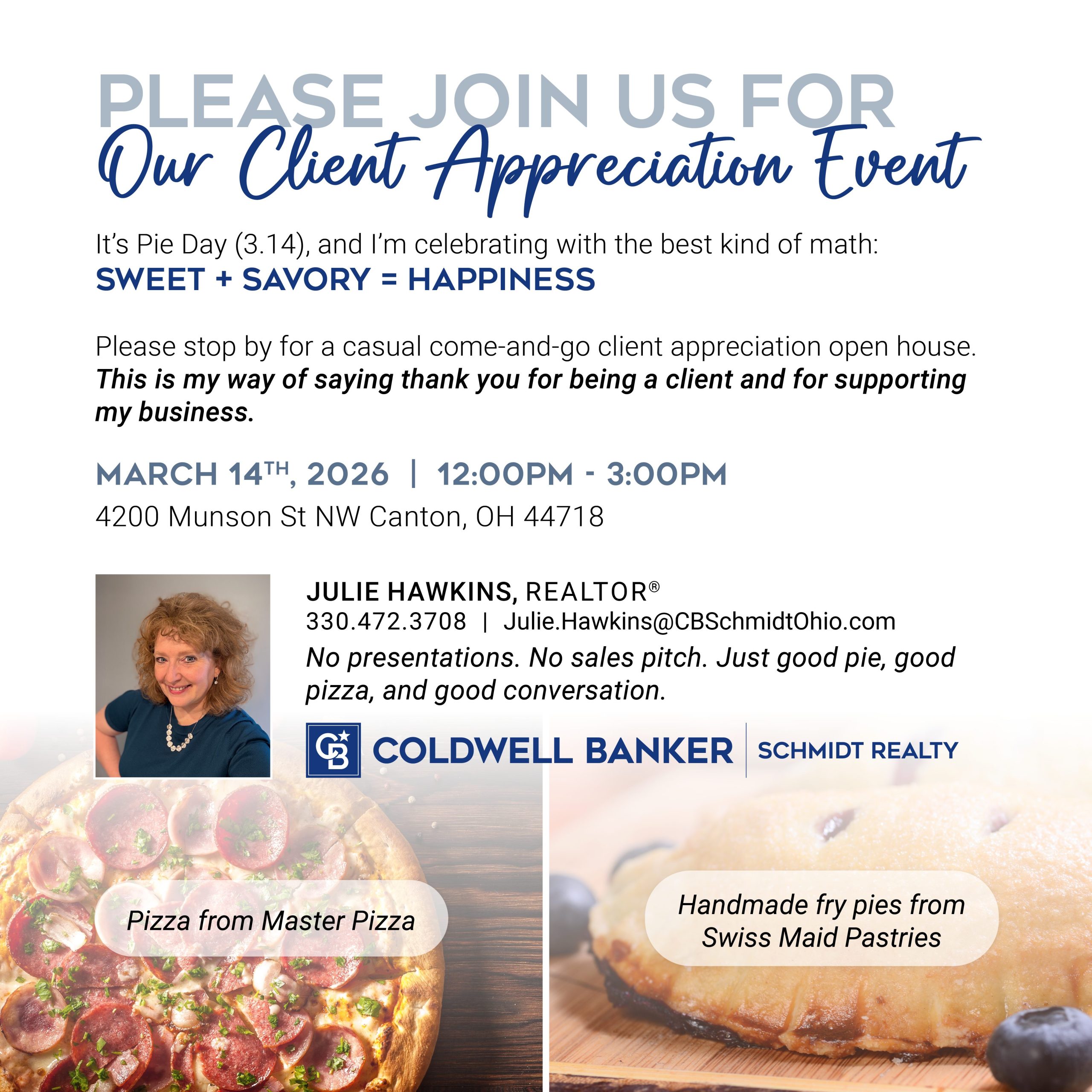 It’s a casual come-and-go client appreciation open house. This is my way of saying thank you for being a client and supporting my business. There’s no cost to you. To help me plan (and make sure we have enough for everyone!) please RSVP by copying and pasting URL address to your browser https://www.eventbrite.com/e/pie-day-client-appreciation-open-house-tickets-1981885751634.